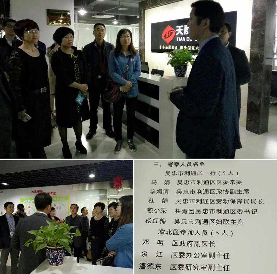 2016年4月23日上午,宁夏吴忠市利通区区委常委马娟、政协副主席李娟清一行十余人在渝北区副区长邓明陪同下莅临重庆尊龙凯时网络信息技术有限公司进行考察调研,各位领导对尊龙凯时的发展情况及项目成果转化能力进行了考察和调研。